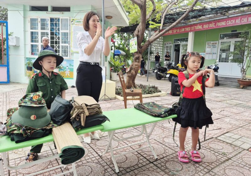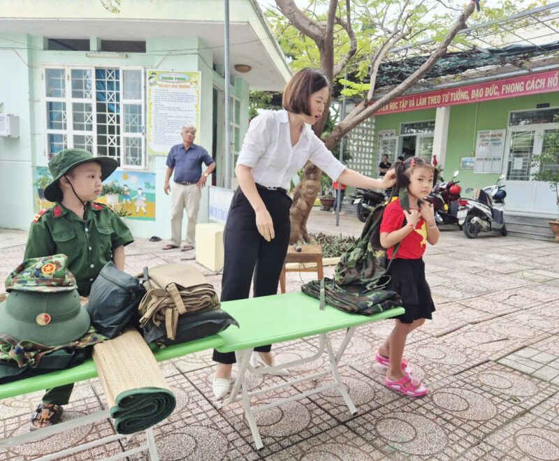 Sáng nay, ngày 08/12/2025 sau giờ chào cờ, các bé đã được làm quen với những đồ dùng cá nhân của các chú bộ đội khi hành quân. Các con vô cùng thích thú khi được quan sát và trải nghiệm thử balo, mũ, võng cùng nhiều vật dụng quen thuộc của chú bộ đội.