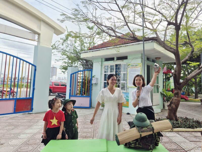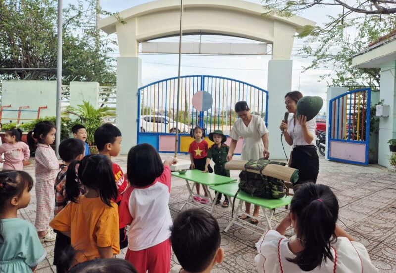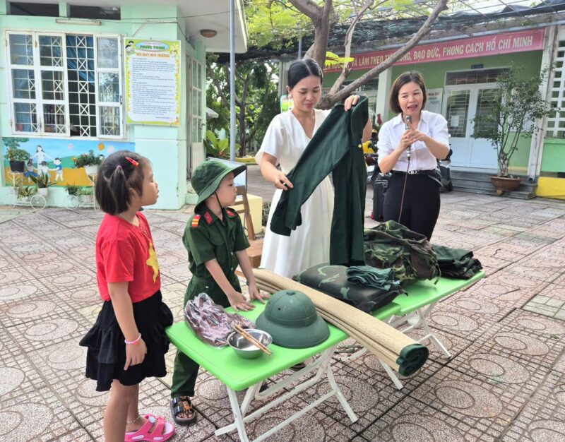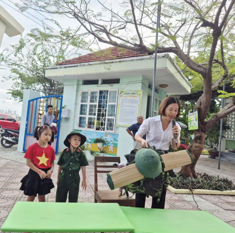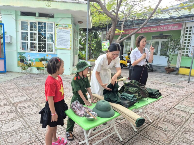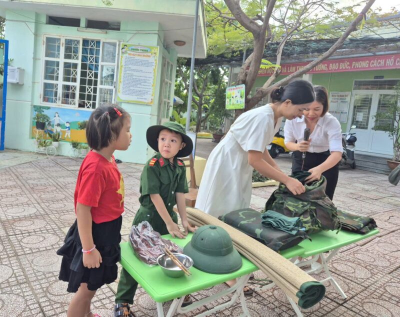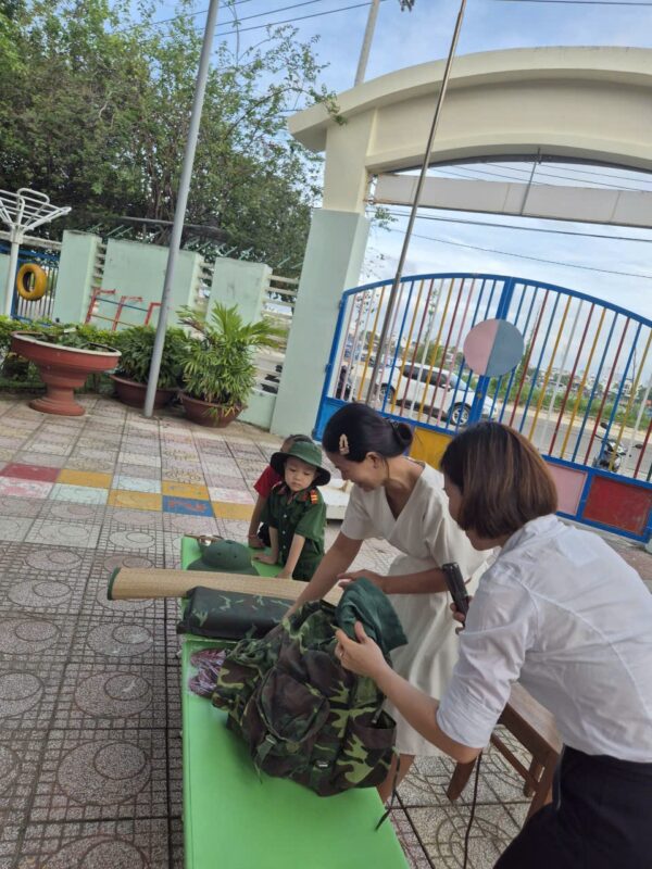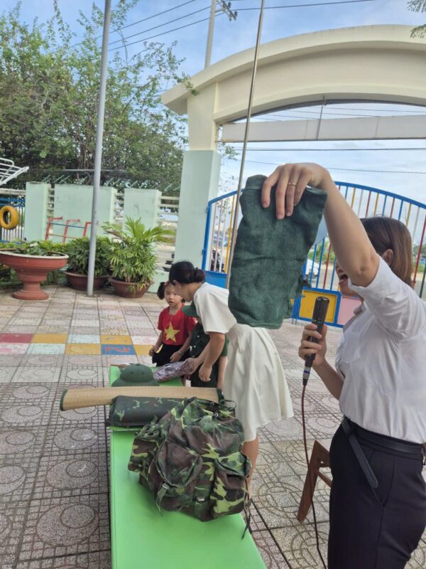 Sáng nay, ngày 08/12/2025 sau giờ chào cờ, các bé đã được làm quen với những đồ dùng cá nhân của các chú bộ đội khi hành quân. Các con vô cùng thích thú khi được quan sát và trải nghiệm thử balo, mũ, võng cùng nhiều vật dụng quen thuộc của chú bộ đội.