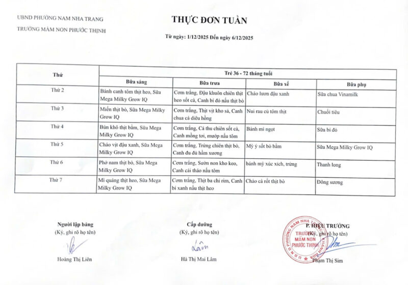Thực đơn tuần 12 từ 24/11 đến 29/11/2025