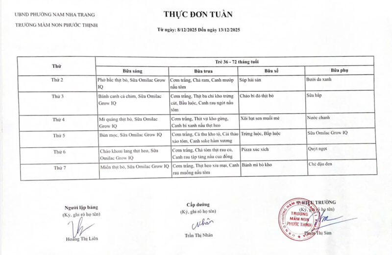 Thực đơn tuần 14 từ 08/12 đến 13/12/2025