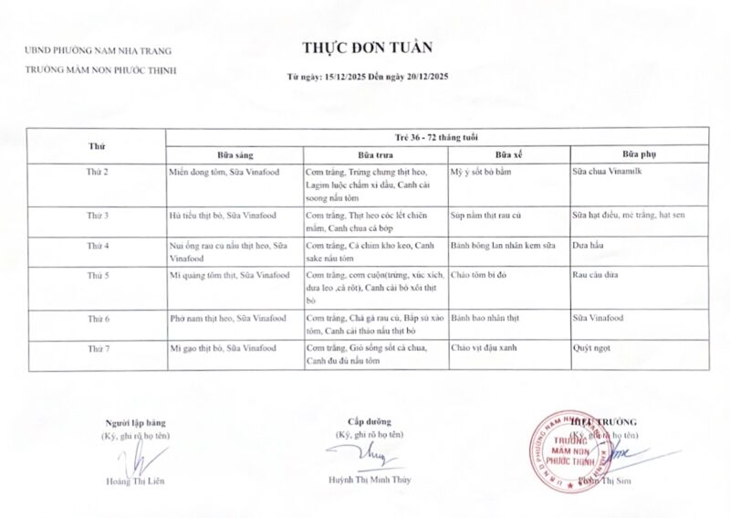 Thực đơn tuần 15 từ 15/12 đến 20/12/2025