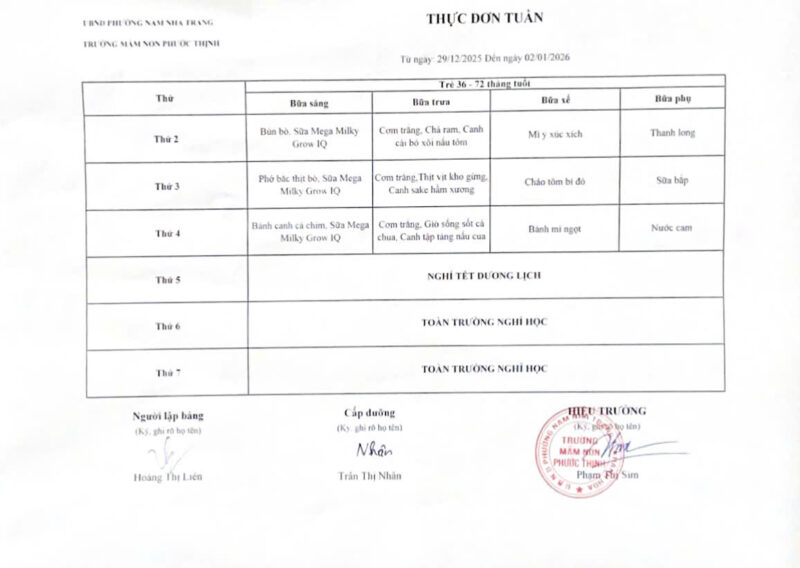 Thực đơn tuần 17 từ 29/12/2025 đến 03/01/2026