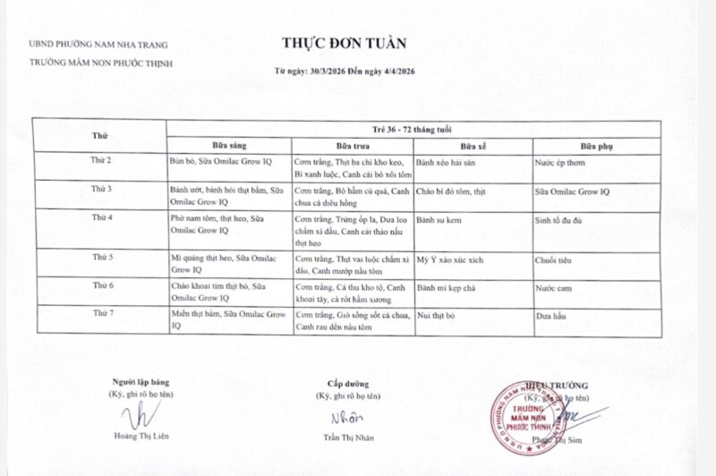 Thực đơn tuần 30 từ ngày 30/3 đến 04/4/2026