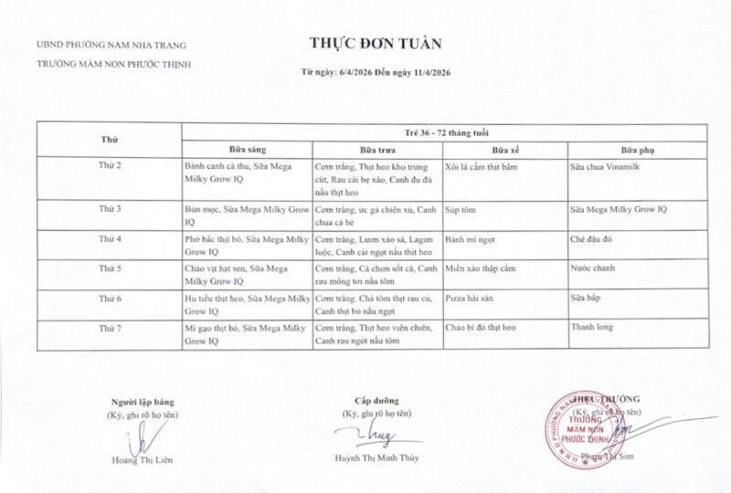 Thực đơn tuần 31 từ ngày 06/4 – 11/4/2026