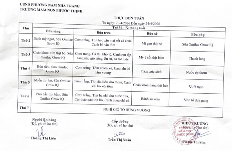 Thực đơn tuần 32 từ ngày 13/4 – 18/4/2026