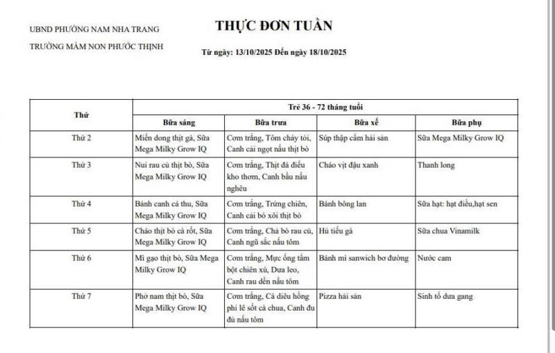 Thực đơn tuần 6 từ 13/10 đến 18/10/2025