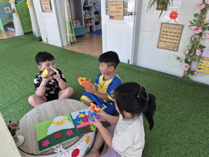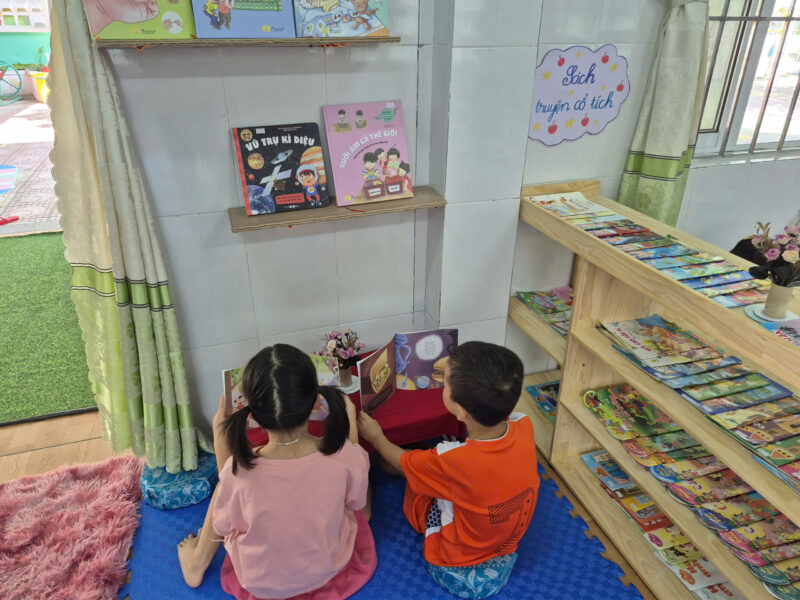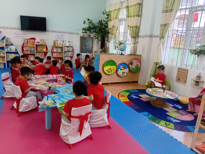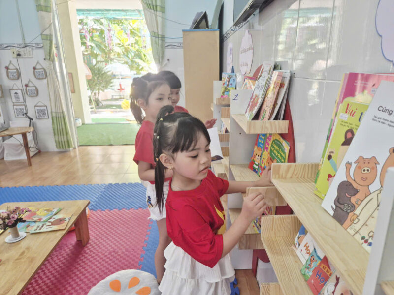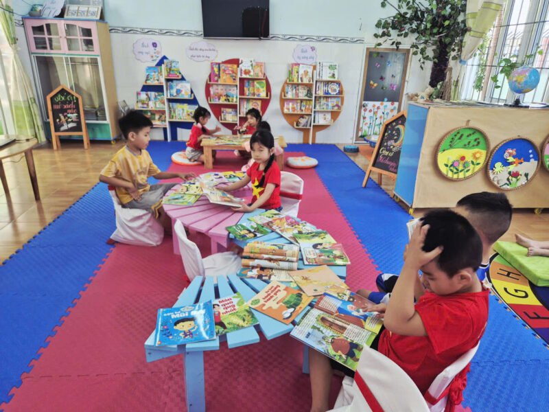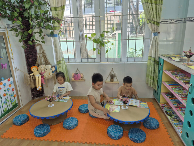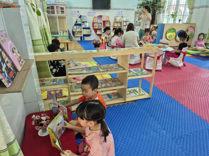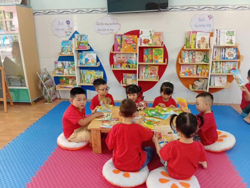 Song song với các hoạt động tập trung, tại các lớp học, hoạt động đọc sách ở góc thư viện cũng được duy trì thường xuyên và hiệu quả. Giáo viên linh hoạt tổ chức cho trẻ làm quen với sách qua nhiều hình thức như đọc sách theo nhóm nhỏ, kể chuyện sáng tạo, trao đổi nội dung câu chuyện… Qua đó giúp trẻ hình thành thói quen đọc sách, biết giữ gìn sách và phát triển kỹ năng ngôn ngữ một cách tự nhiên.