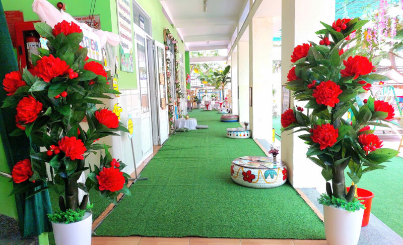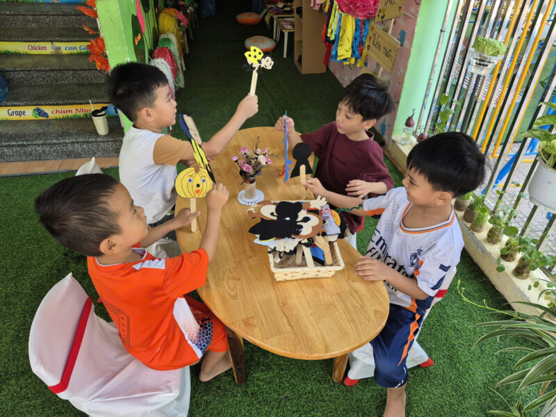 Bên cạnh đó, nhà trường còn tổ chức đón các đơn vị bạn đến tham quan và trải nghiệm tại thư viện. Không gian thư viện được đầu tư, bày trí đẹp mắt với mô hình mở, gần gũi thiên nhiên, tạo điều kiện để trẻ được tiếp cận sách một cách tự nhiên và hứng thú. Tại đây, trẻ được tự do vẽ lại những câu chuyện mình yêu thích trên các tấm bìa carton khổ lớn, cùng nhau đọc sách dưới những tán cây xanh mát, hình thành niềm vui và sự say mê với sách.